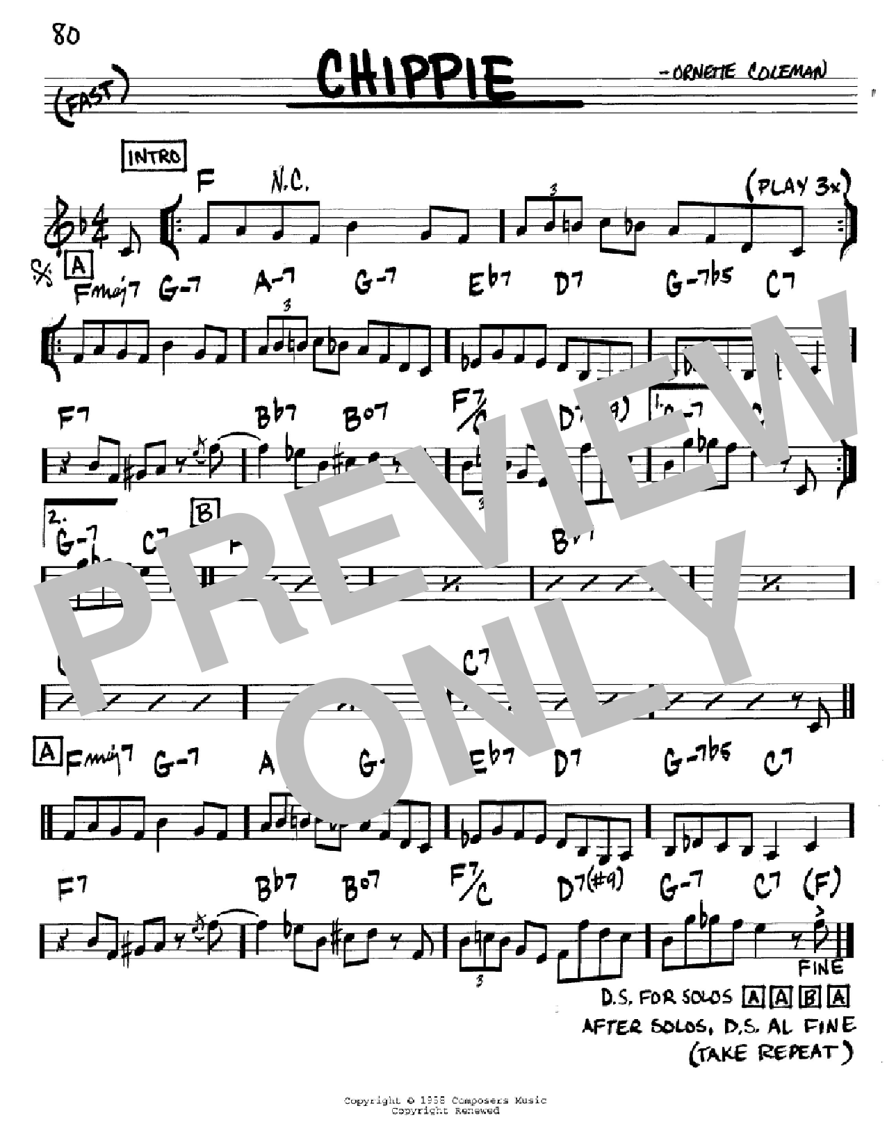 Download or print Ornette Coleman Chippie sheet music, chords and digital score arranged for Real Book – Melody & Chords – C Instruments. This Jazz score includes 1 page(s).