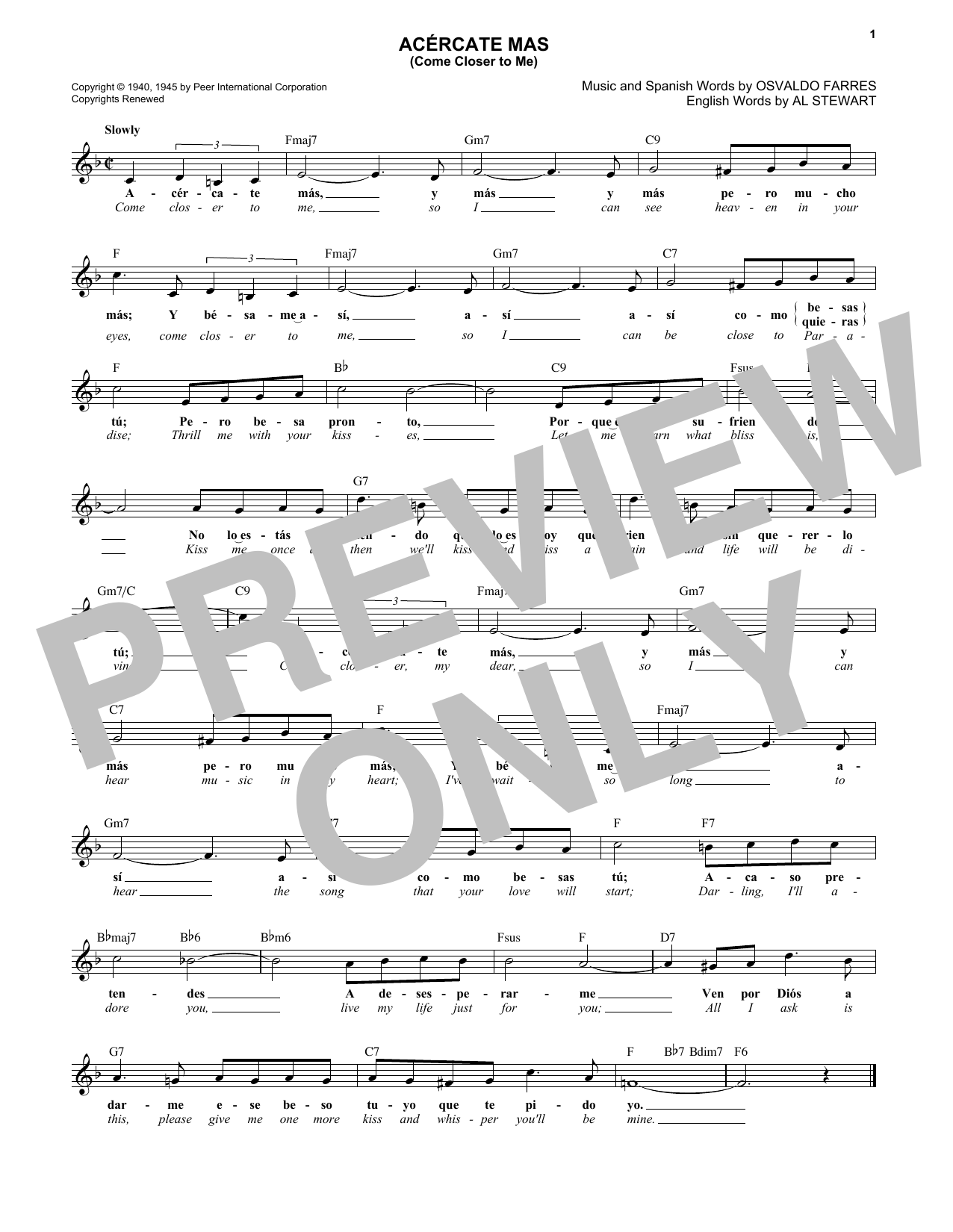 Download or print Osvaldo Farres Acercate Más (Come Closer To Me) sheet music, chords and digital score arranged for Lead Sheet / Fake Book. This Latin score includes 1 page(s).