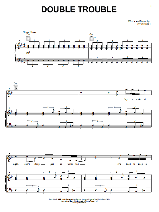 Download or print Otis Rush Double Trouble sheet music, chords and digital score arranged for Piano, Vocal & Guitar Chords (Right-Hand Melody). This Pop score includes 4 page(s).