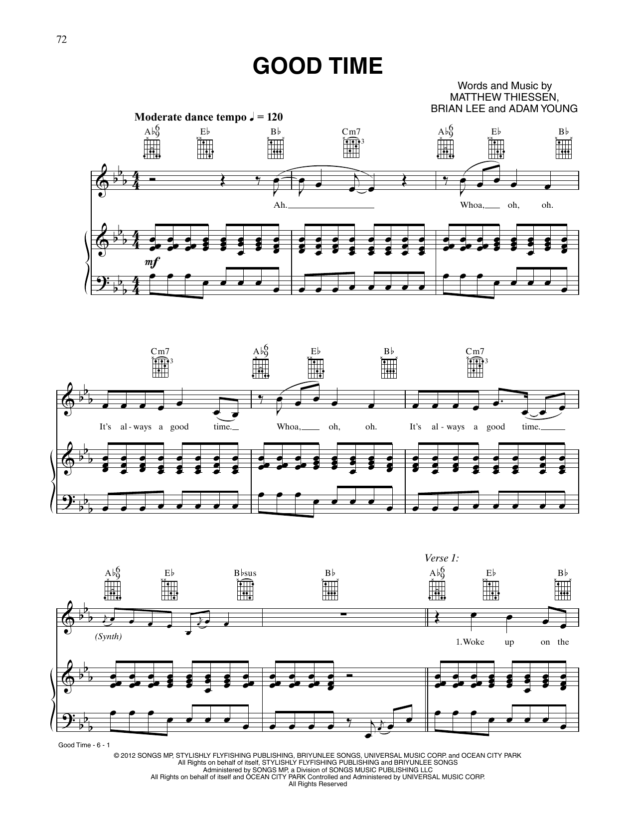 Download or print Owl City and Carly Rae Jepsen Good Time sheet music, chords and digital score arranged for Piano, Vocal & Guitar Chords (Right-Hand Melody). This Pop score includes 6 page(s).