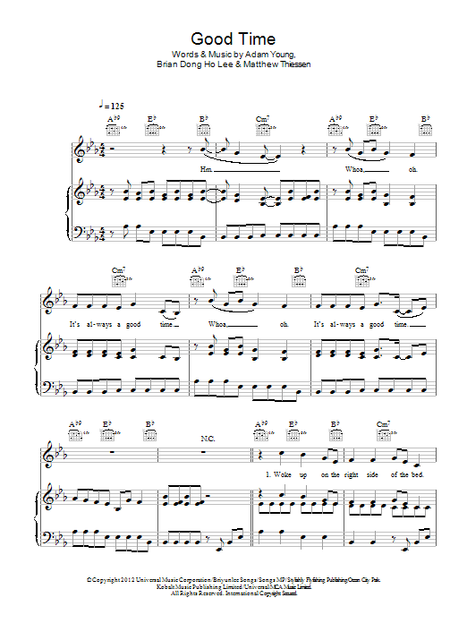 Download or print Owl City featuring Carly Rae Jepsen Good Time sheet music, chords and digital score arranged for Piano, Vocal & Guitar Chords. This Pop score includes 5 page(s).
