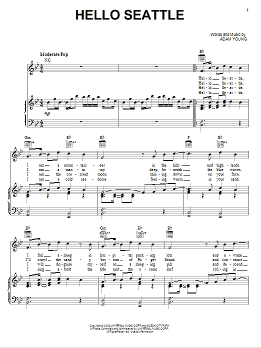 Download or print Owl City Hello Seattle sheet music, chords and digital score arranged for Piano, Vocal & Guitar Chords (Right-Hand Melody). This Pop score includes 4 page(s).