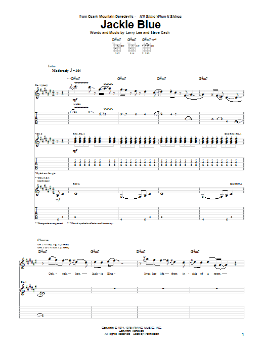 Download or print Ozark Mountain Daredevils Jackie Blue sheet music, chords and digital score arranged for Piano, Vocal & Guitar Chords (Right-Hand Melody). This Country score includes 3 page(s).