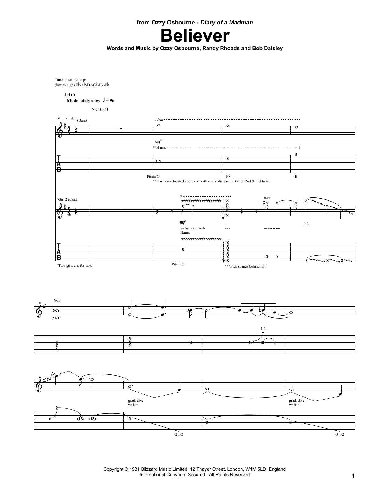 Download or print Ozzy Osbourne Believer sheet music, chords and digital score arranged for Guitar Tab. This Metal score includes 6 page(s).