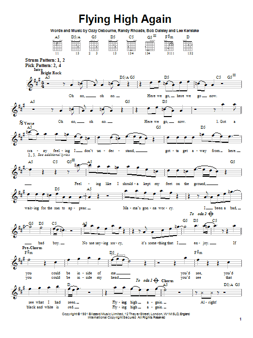Download or print Ozzy Osbourne Flying High Again sheet music, chords and digital score arranged for Guitar Tab. This Metal score includes 12 page(s).