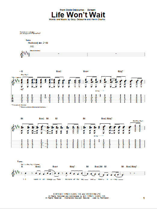 Download or print Ozzy Osbourne Life Won't Wait sheet music, chords and digital score arranged for Guitar Tab. This Metal score includes 9 page(s).