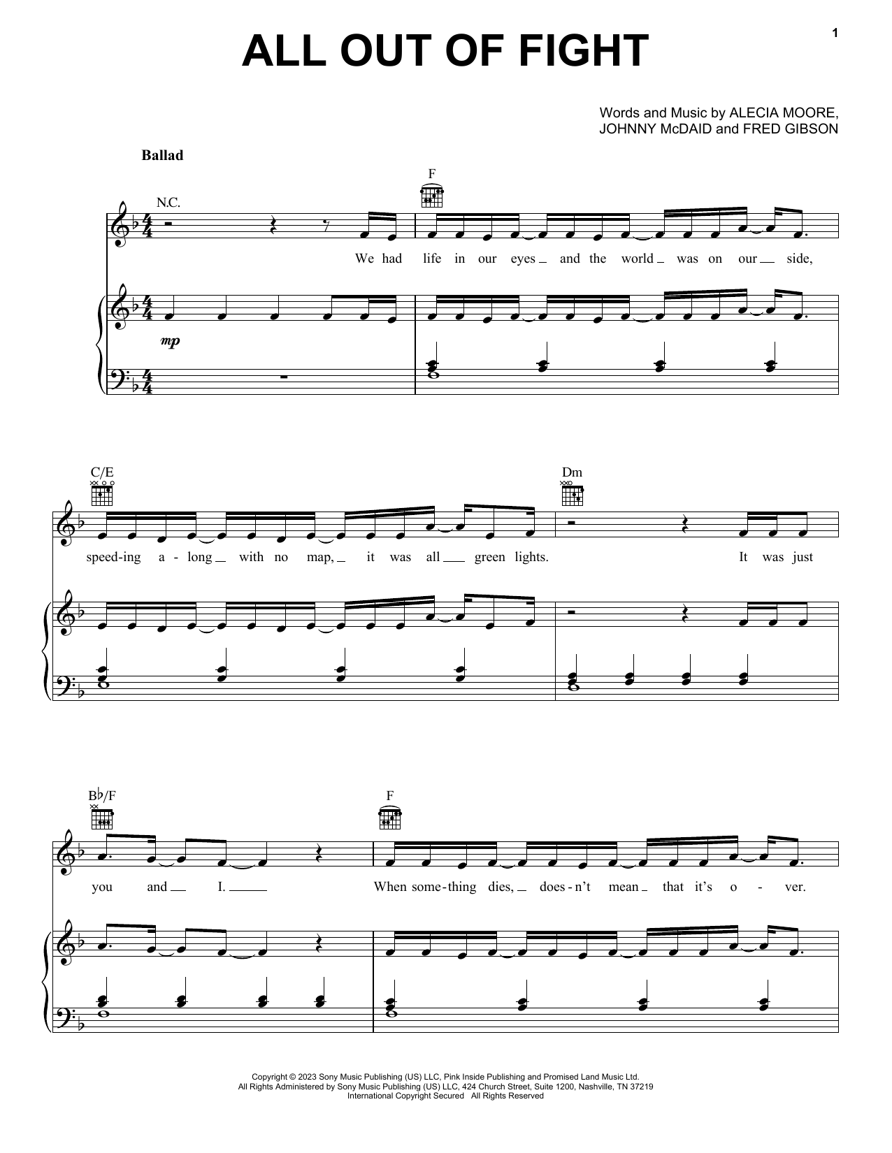 Download or print P!nk All Out Of Fight sheet music, chords and digital score arranged for Piano, Vocal & Guitar Chords (Right-Hand Melody). This Pop score includes 7 page(s).