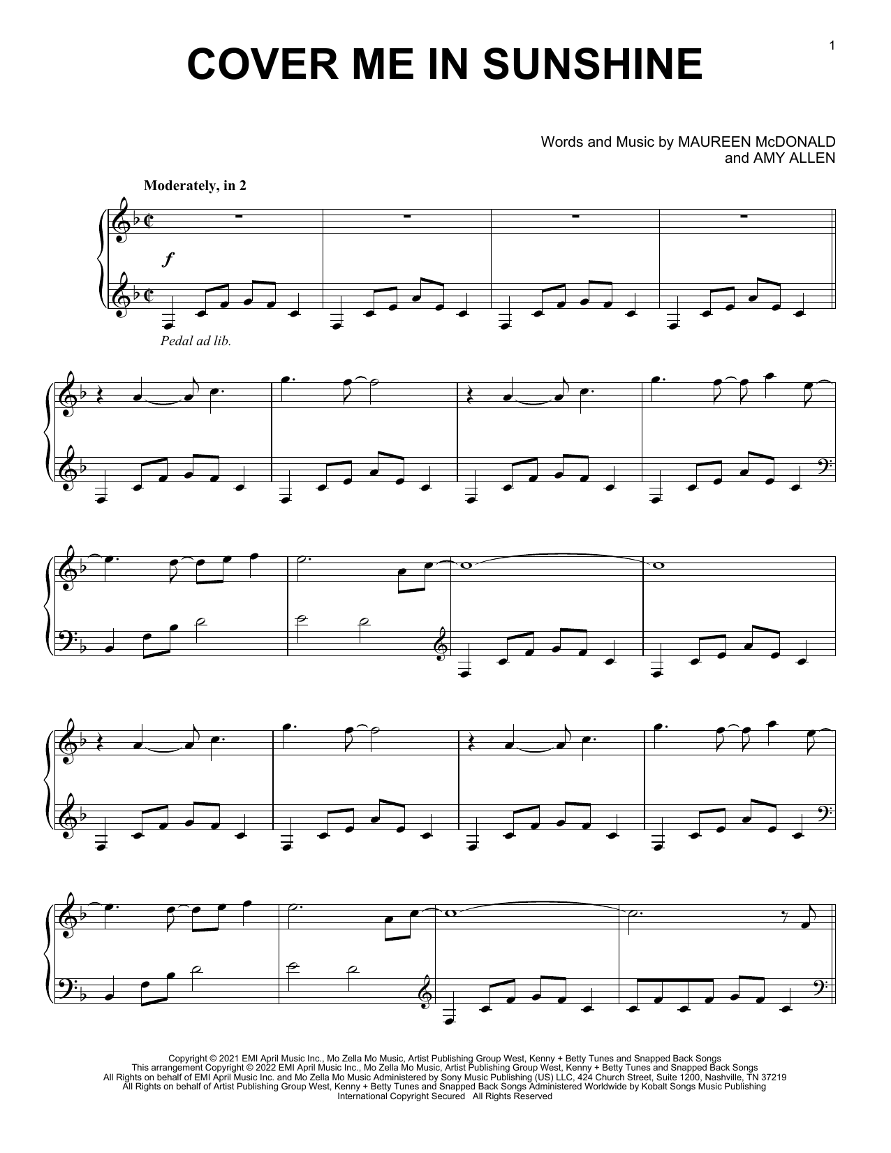 Download or print P!nk and Willow Sage Hart Cover Me In Sunshine sheet music, chords and digital score arranged for Piano Solo. This Pop score includes 4 page(s).