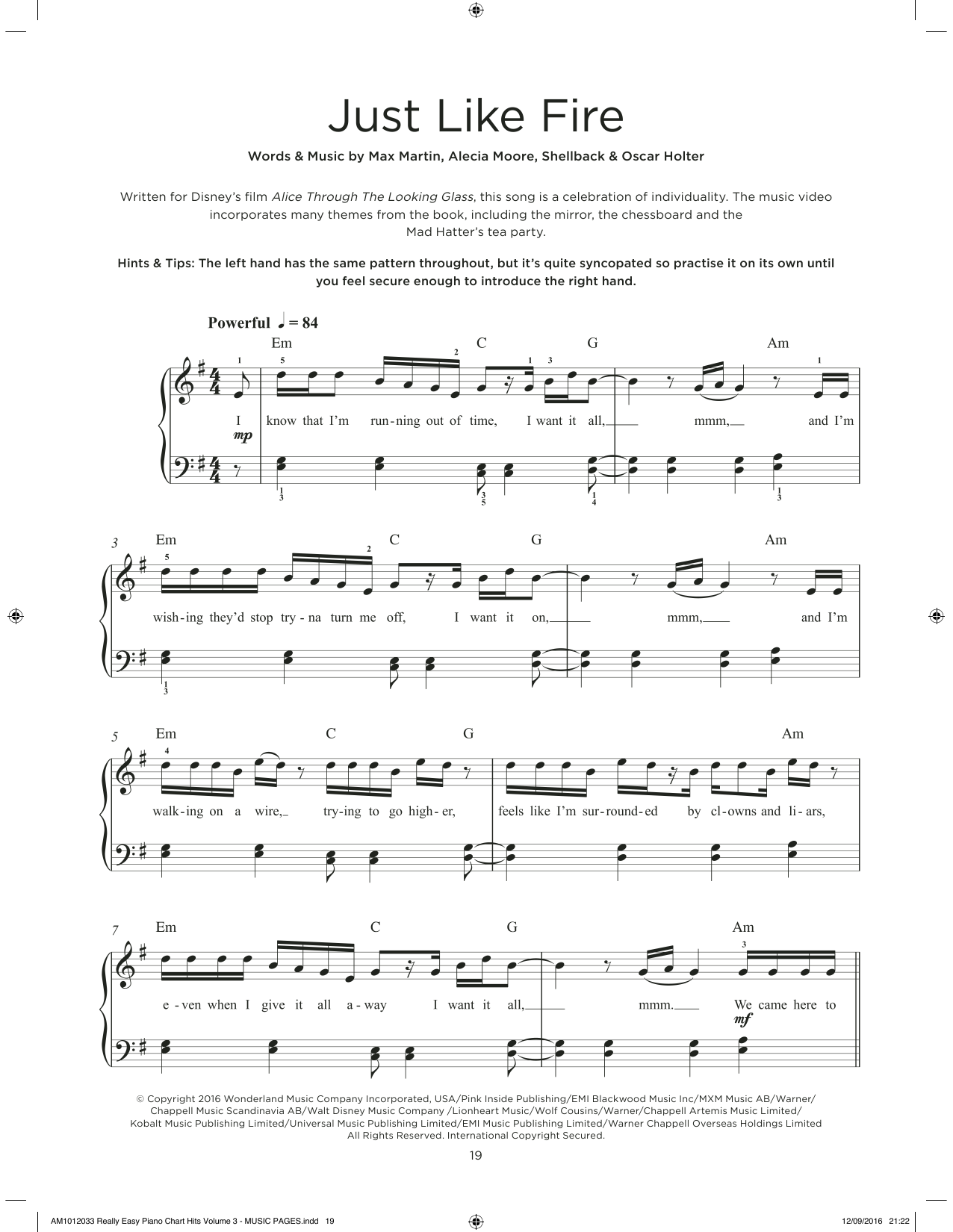 Download or print P!nk Just Like Fire (from Alice Through The Looking Glass) sheet music, chords and digital score arranged for Really Easy Piano. This Pop score includes 3 page(s).