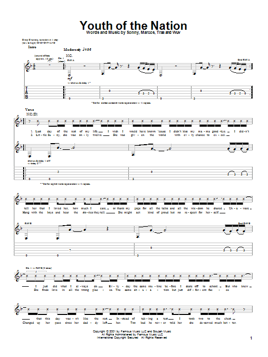 Download or print P.O.D. (Payable On Death) Youth Of The Nation sheet music, chords and digital score arranged for Guitar Tab. This Rock score includes 5 page(s).