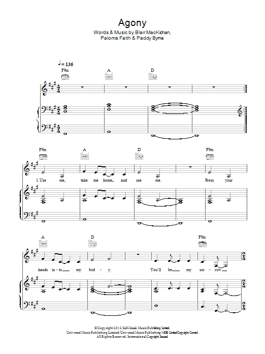 Download or print Paloma Faith Agony sheet music, chords and digital score arranged for Piano, Vocal & Guitar Chords. This Soul score includes 5 page(s).