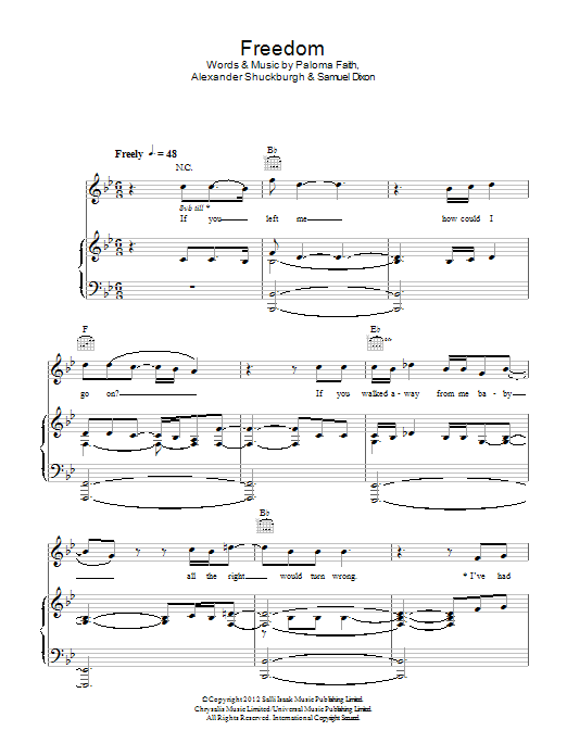 Download or print Paloma Faith Freedom sheet music, chords and digital score arranged for Piano, Vocal & Guitar Chords. This Soul score includes 7 page(s).