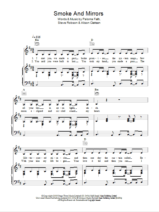 Download or print Paloma Faith Smoke And Mirrors sheet music, chords and digital score arranged for Piano, Vocal & Guitar Chords. This Pop score includes 5 page(s).