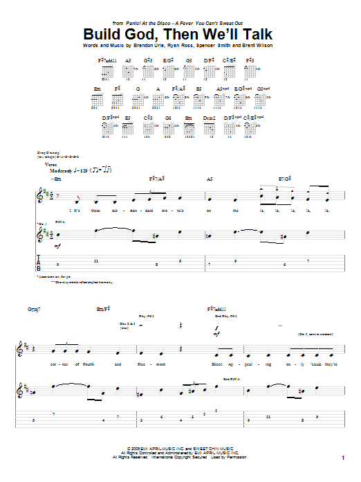 Download or print Panic! At The Disco Build God, Then We'll Talk sheet music, chords and digital score arranged for Guitar Tab. This Pop score includes 9 page(s).