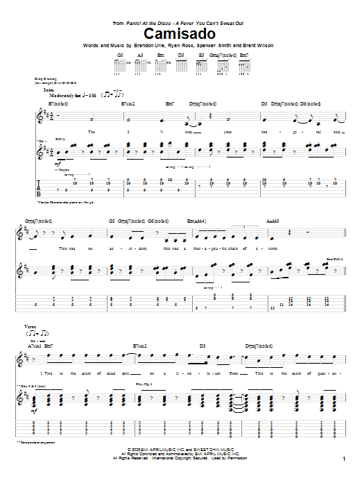 Download or print Panic! At The Disco Camisado sheet music, chords and digital score arranged for Guitar Tab. This Pop score includes 8 page(s).