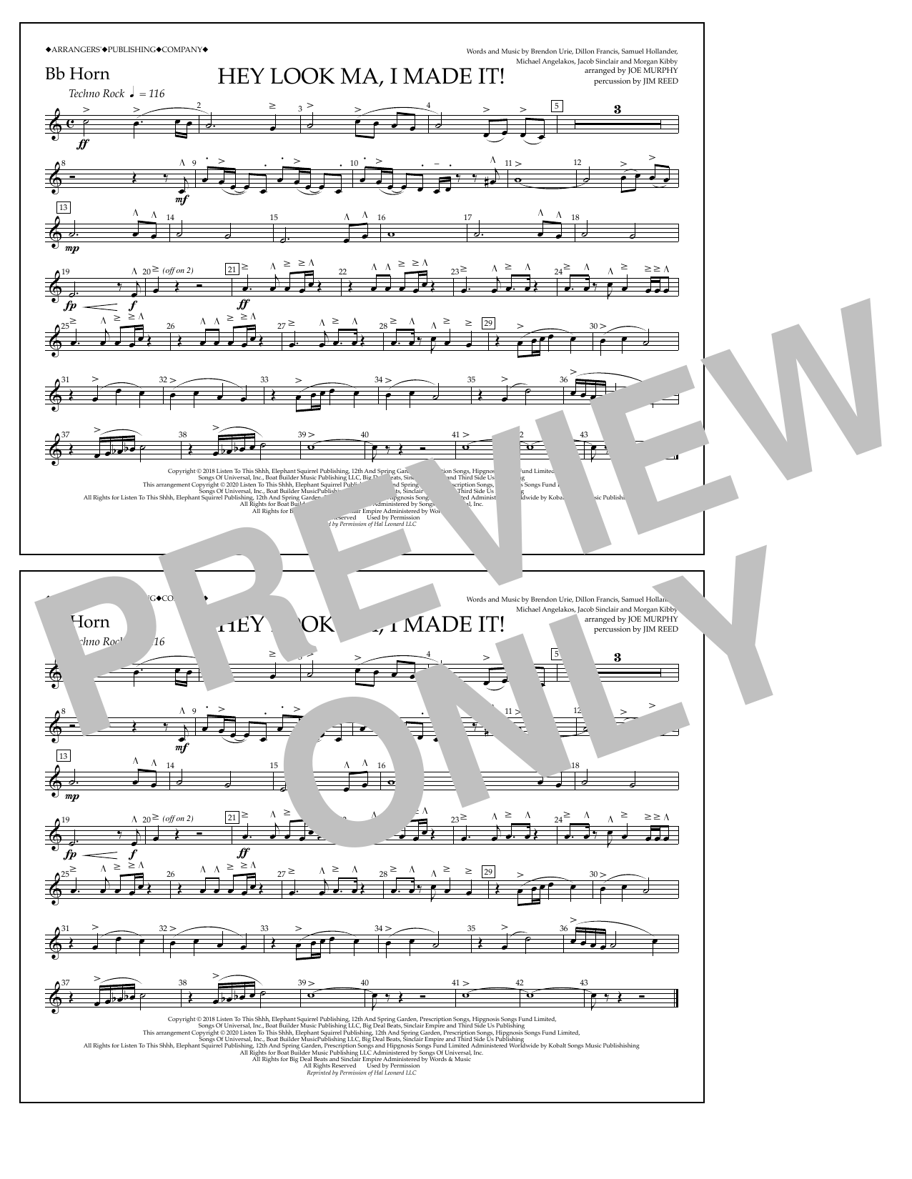 Download or print Panic! At The Disco Hey Look Ma, I Made It (arr. Joe Murphy) - Bb Horn sheet music, chords and digital score arranged for Marching Band. This Pop score includes 1 page(s).