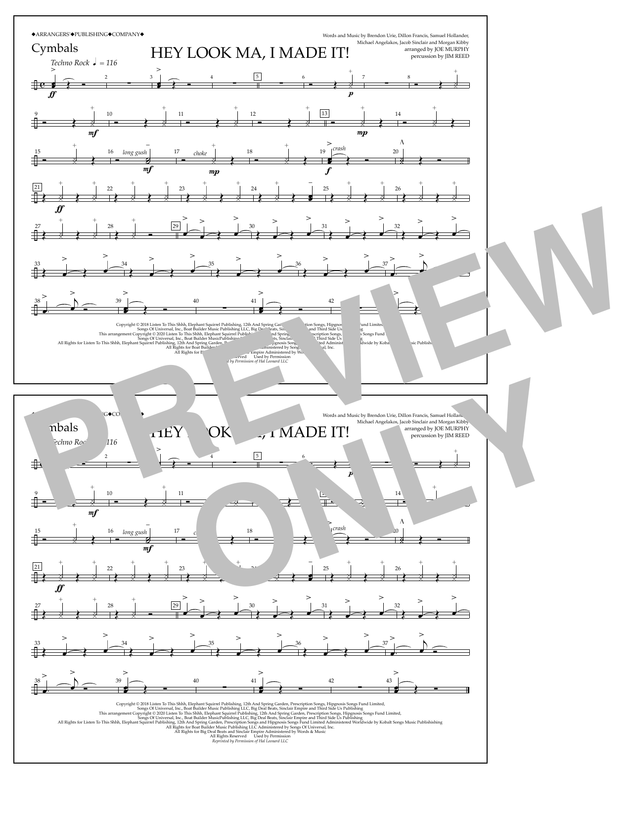 Download or print Panic! At The Disco Hey Look Ma, I Made It (arr. Joe Murphy) - Cymbals sheet music, chords and digital score arranged for Marching Band. This Pop score includes 1 page(s).