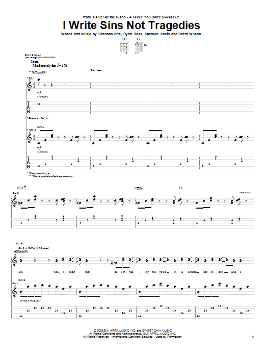 Download or print Panic! At The Disco I Write Sins Not Tragedies sheet music, chords and digital score arranged for Guitar Tab. This Pop score includes 8 page(s).