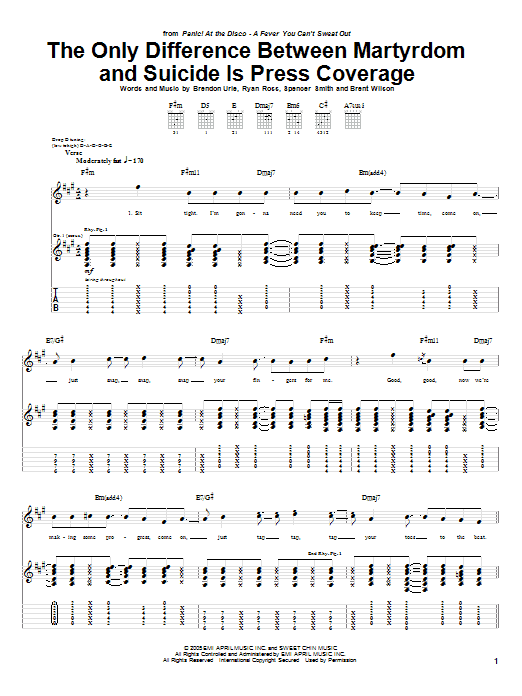 Download or print Panic! At The Disco The Only Difference Between Martyrdom And Suicide Is Press Coverage sheet music, chords and digital score arranged for Guitar Tab. This Pop score includes 6 page(s).