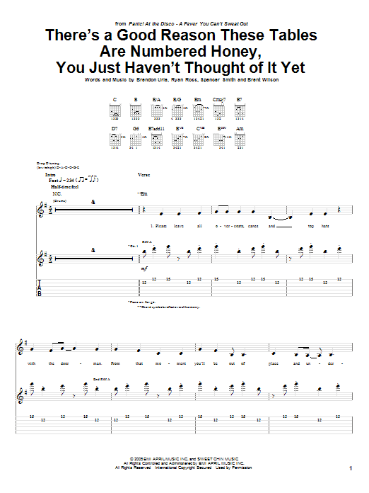 Download or print Panic! At The Disco There's A Good Reason These Tables Are Numbered Honey, You Just Haven't Thought Of It Yet sheet music, chords and digital score arranged for Guitar Tab. This Pop score includes 10 page(s).