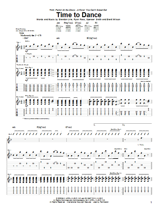 Download or print Panic! At The Disco Time To Dance sheet music, chords and digital score arranged for Guitar Tab. This Pop score includes 8 page(s).