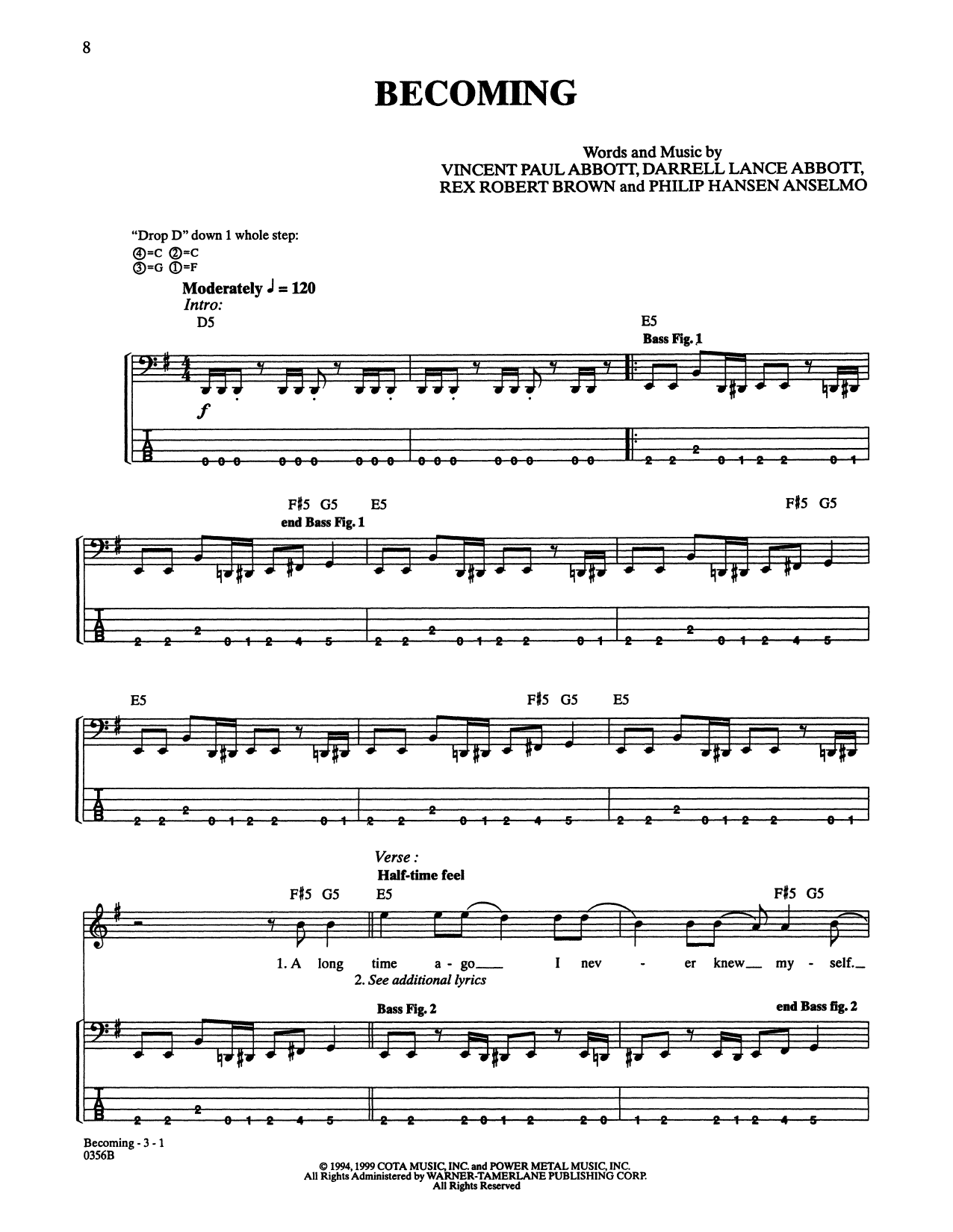 Download or print Pantera Becoming sheet music, chords and digital score arranged for Bass Guitar Tab. This Rock score includes 3 page(s).