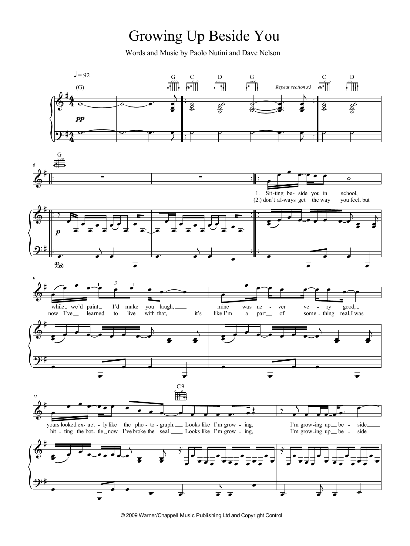 Download or print Paolo Nutini Growing Up Beside You sheet music, chords and digital score arranged for Piano, Vocal & Guitar Chords (Right-Hand Melody). This Pop score includes 5 page(s).