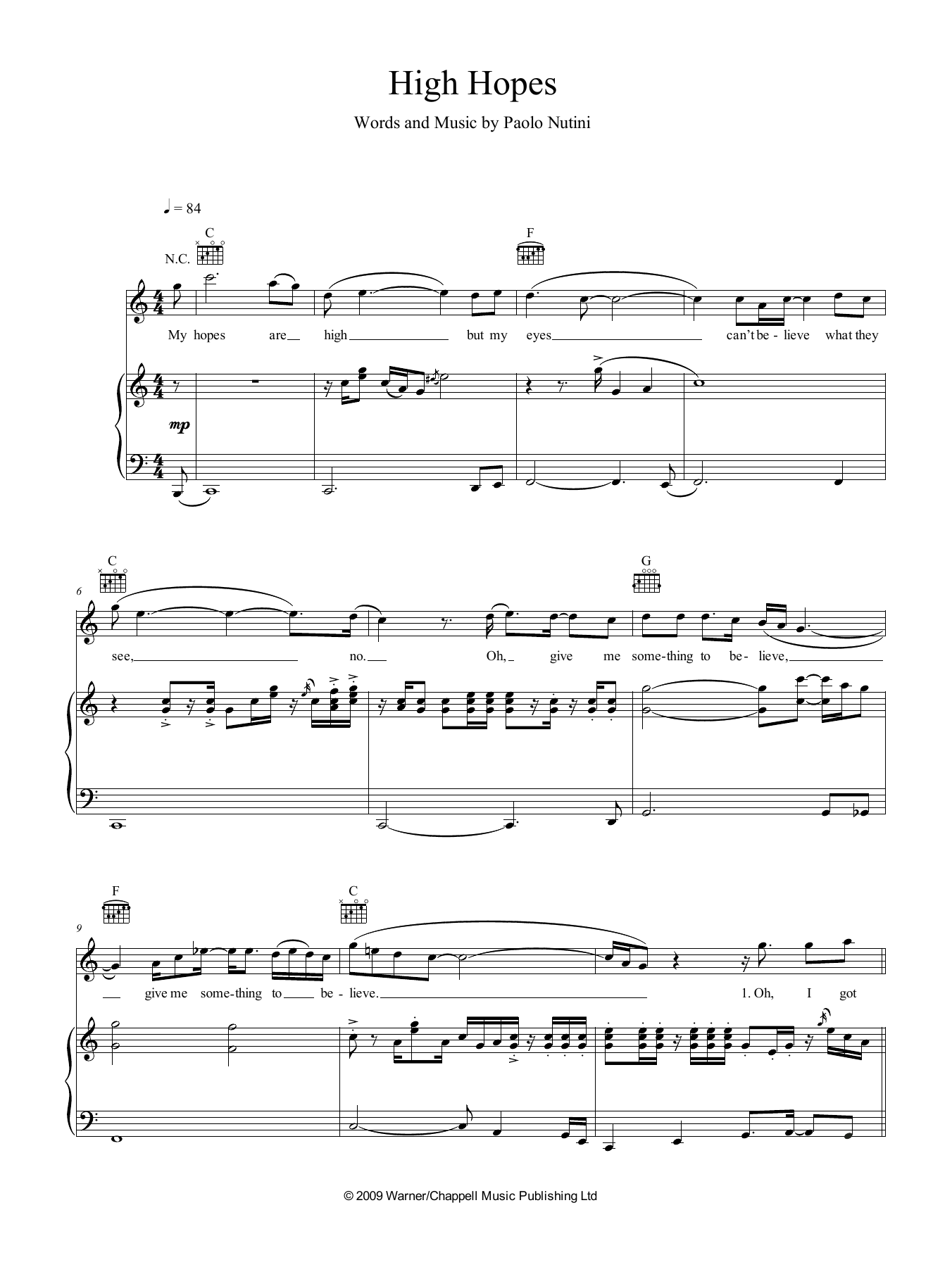 Download or print Paolo Nutini High Hopes sheet music, chords and digital score arranged for Piano, Vocal & Guitar Chords (Right-Hand Melody). This Pop score includes 5 page(s).