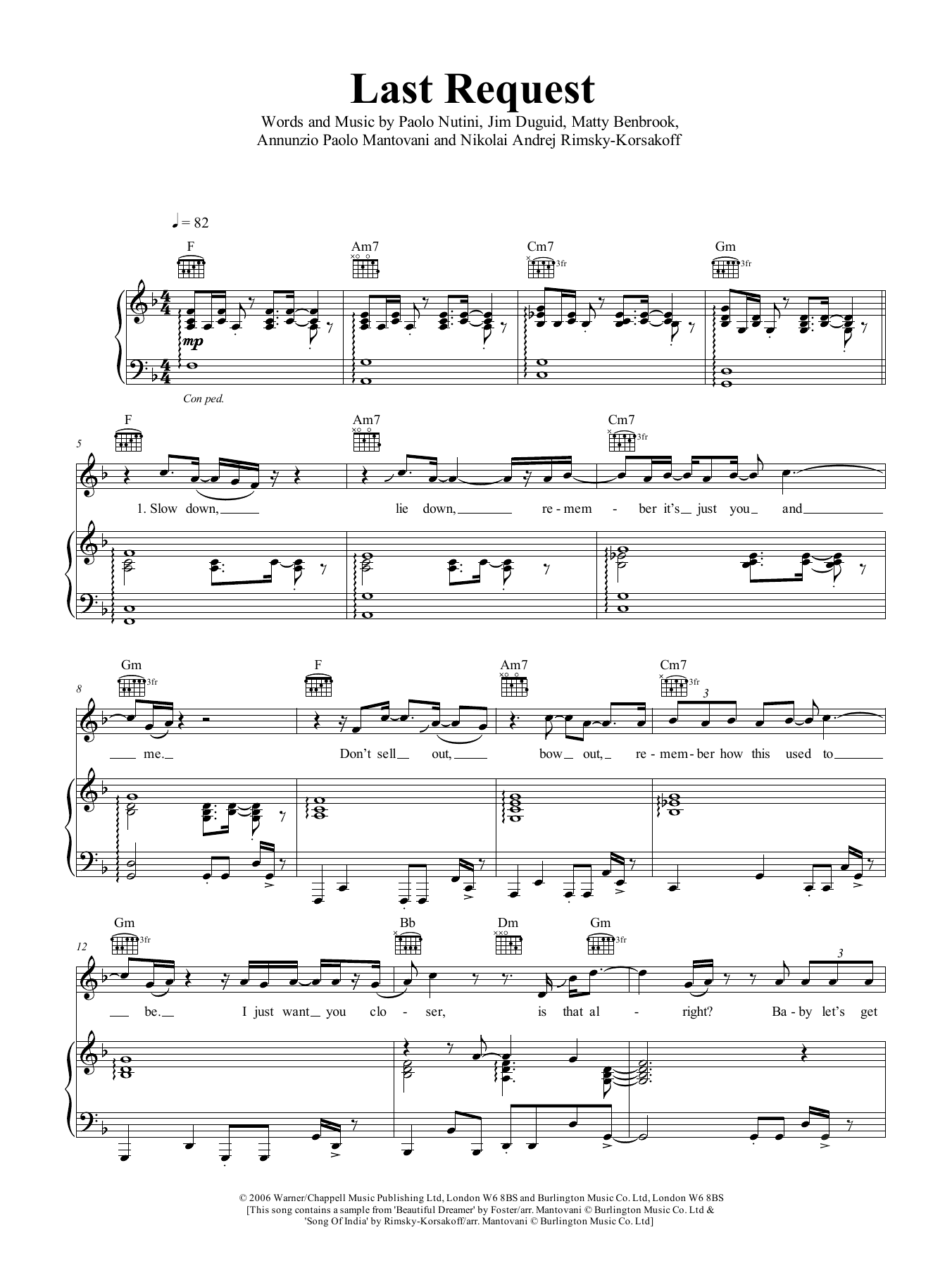 Download or print Paolo Nutini Last Request sheet music, chords and digital score arranged for Piano, Vocal & Guitar Chords (Right-Hand Melody). This Pop score includes 5 page(s).