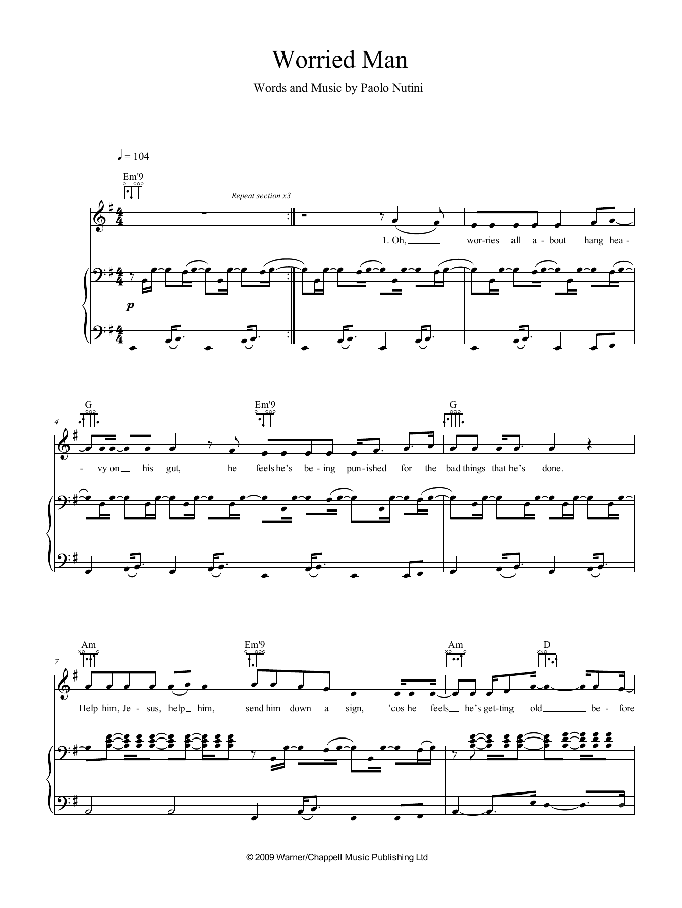 Download or print Paolo Nutini Worried Man sheet music, chords and digital score arranged for Piano, Vocal & Guitar Chords (Right-Hand Melody). This Pop score includes 6 page(s).