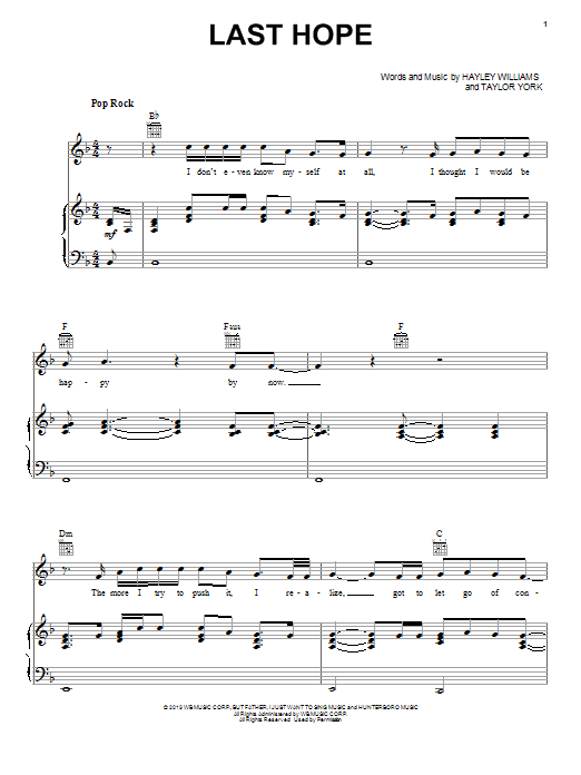 Download or print Paramore Last Hope sheet music, chords and digital score arranged for Piano, Vocal & Guitar Chords (Right-Hand Melody). This Pop score includes 12 page(s).