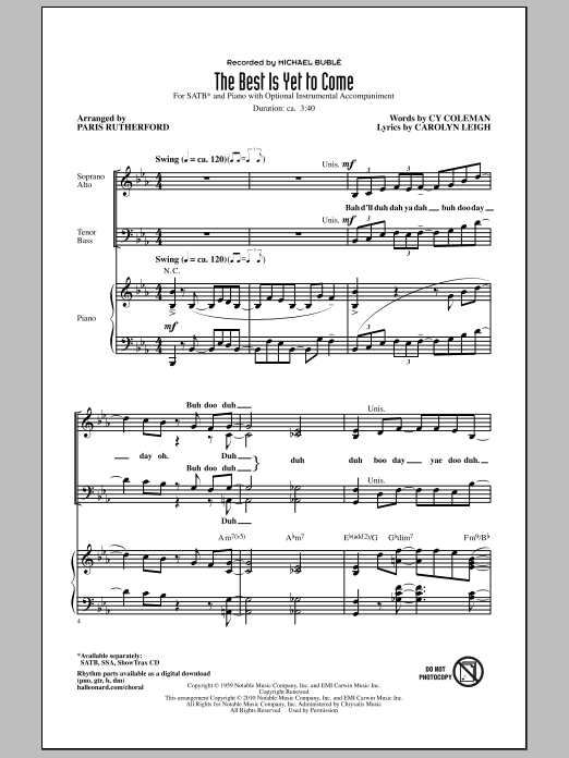 Download or print Paris Rutherford The Best Is Yet To Come sheet music, chords and digital score arranged for SSA Choir. This Jazz score includes 15 page(s).