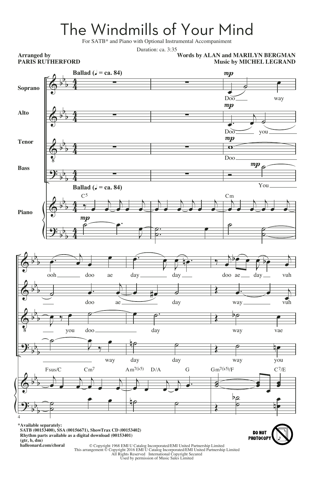 Download or print Michel Legrand The Windmills Of Your Mind (arr. Paris Rutherford) sheet music, chords and digital score arranged for SATB Choir. This Jazz score includes 13 page(s).