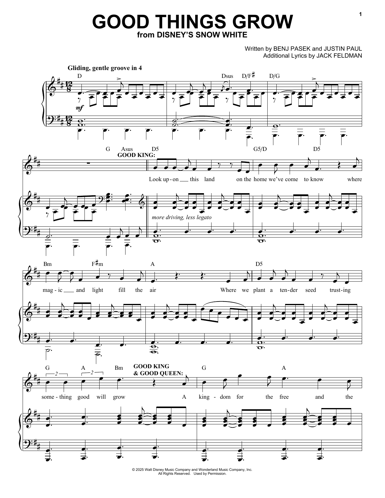 Download or print Pasek & Paul Good Things Grow (from Snow White) (2025) sheet music, chords and digital score arranged for Piano & Vocal. This Disney score includes 13 page(s).
