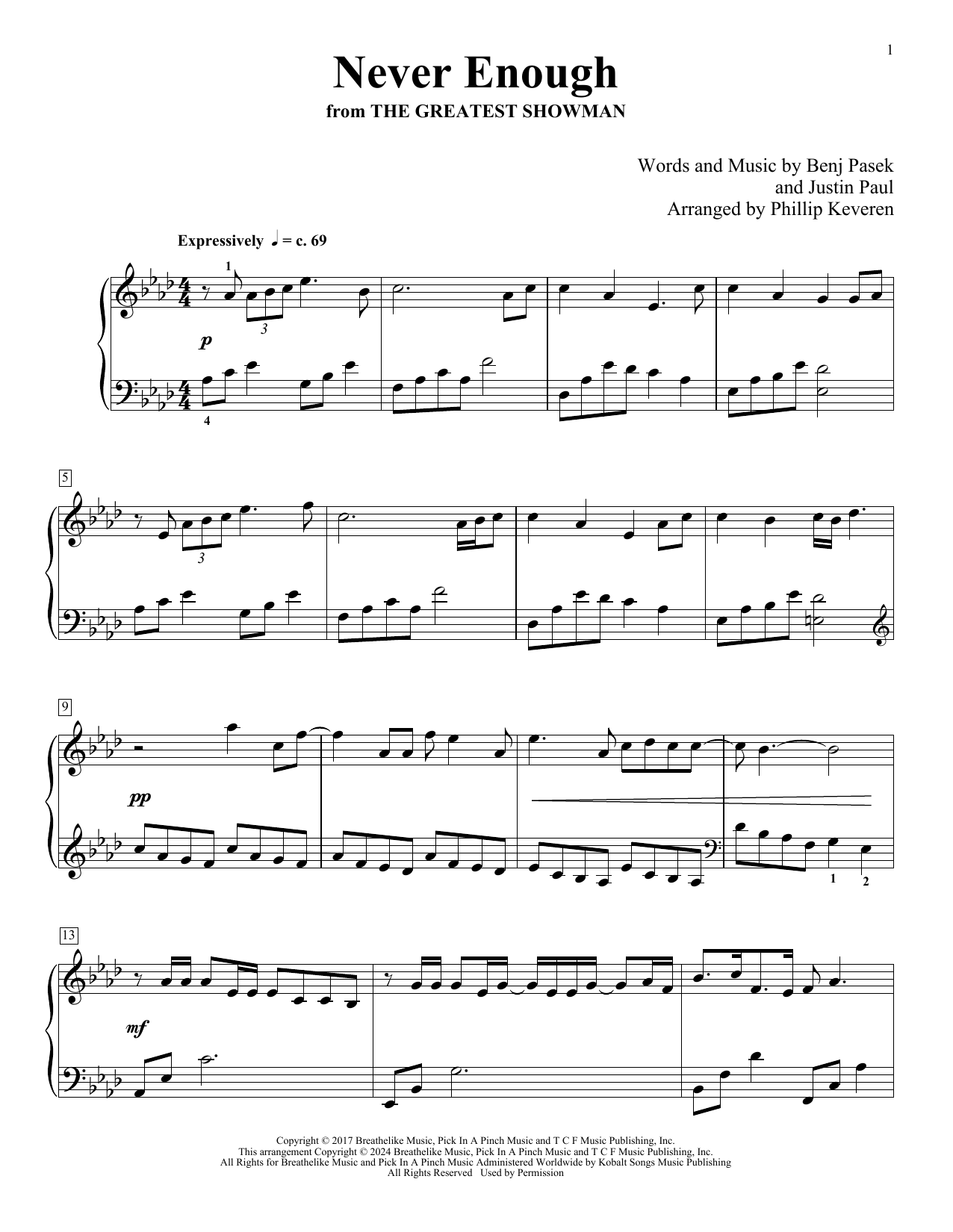 Download or print Pasek & Paul Never Enough (from The Greatest Showman) (arr. Phillip Keveren) sheet music, chords and digital score arranged for Piano Solo. This Pop score includes 3 page(s).