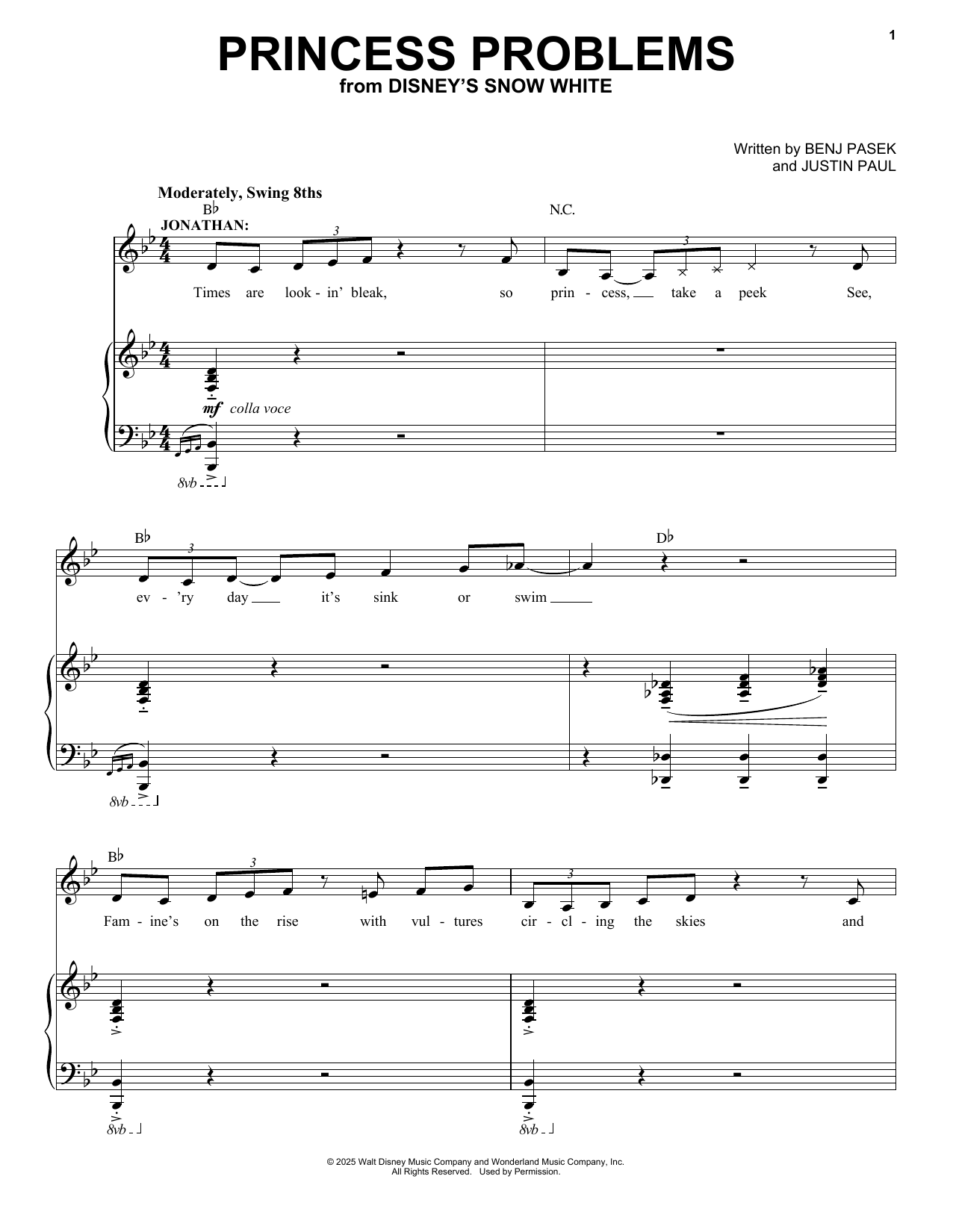 Download or print Pasek & Paul Princess Problems (from Snow White) (2025) sheet music, chords and digital score arranged for Piano & Vocal. This Disney score includes 9 page(s).