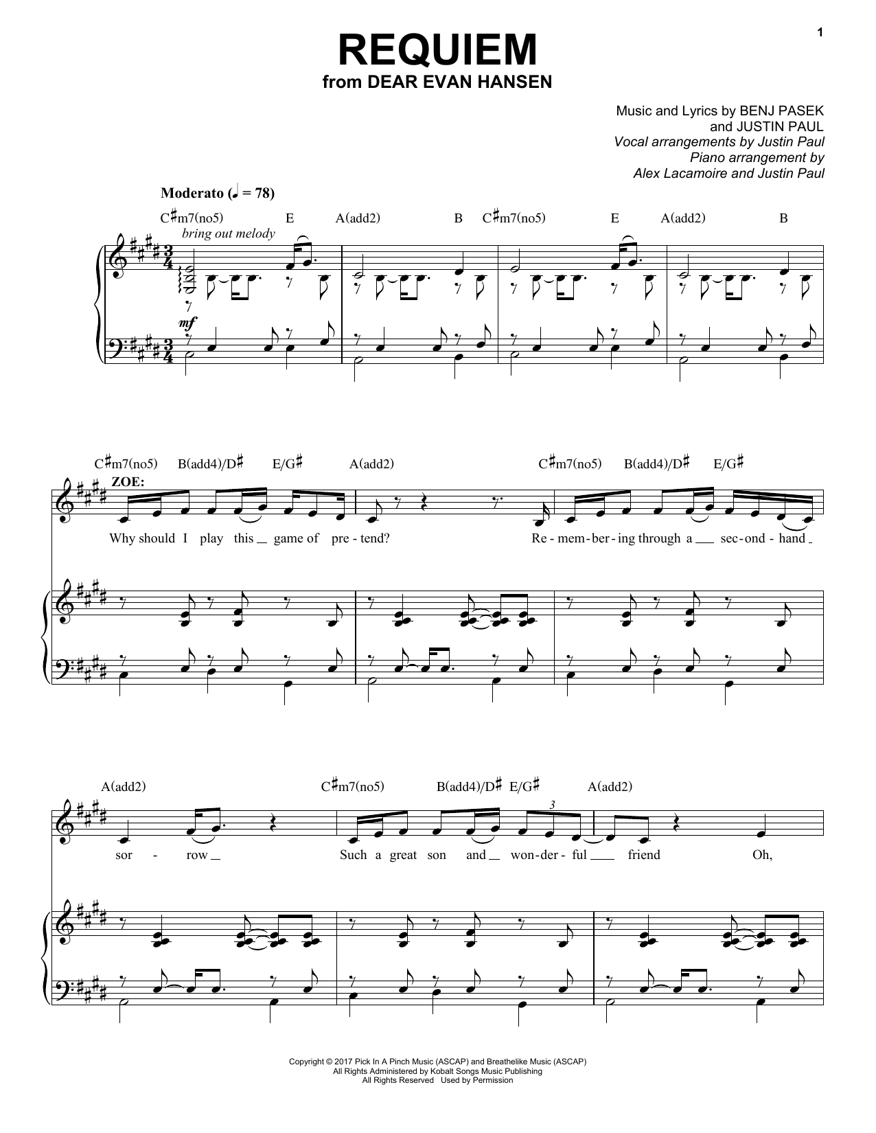 Download or print Pasek & Paul Requiem (from Dear Evan Hansen) sheet music, chords and digital score arranged for Guitar Chords/Lyrics. This Film/TV score includes 4 page(s).