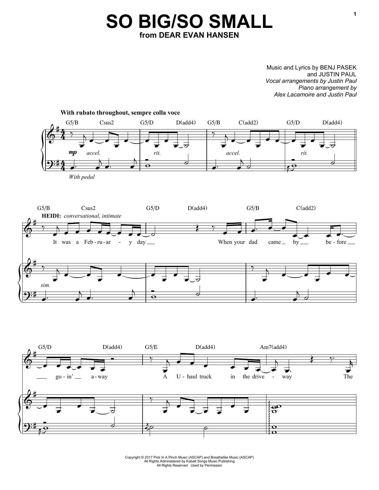 Download or print Pasek & Paul So Big/So Small (from Dear Evan Hansen) sheet music, chords and digital score arranged for Piano & Vocal. This Film/TV score includes 7 page(s).