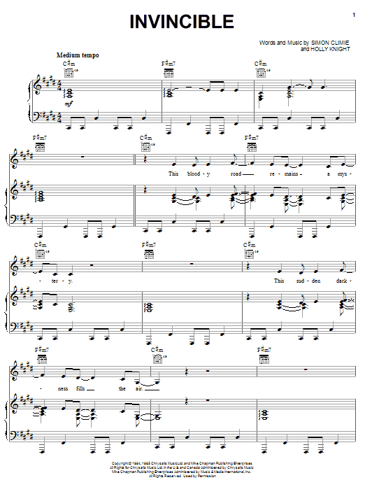 Download or print Pat Benatar Invincible sheet music, chords and digital score arranged for Piano, Vocal & Guitar Chords (Right-Hand Melody). This Pop score includes 6 page(s).
