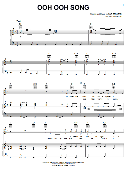 Download or print Pat Benatar Ooh Ooh Song sheet music, chords and digital score arranged for Piano, Vocal & Guitar Chords (Right-Hand Melody). This Pop score includes 13 page(s).