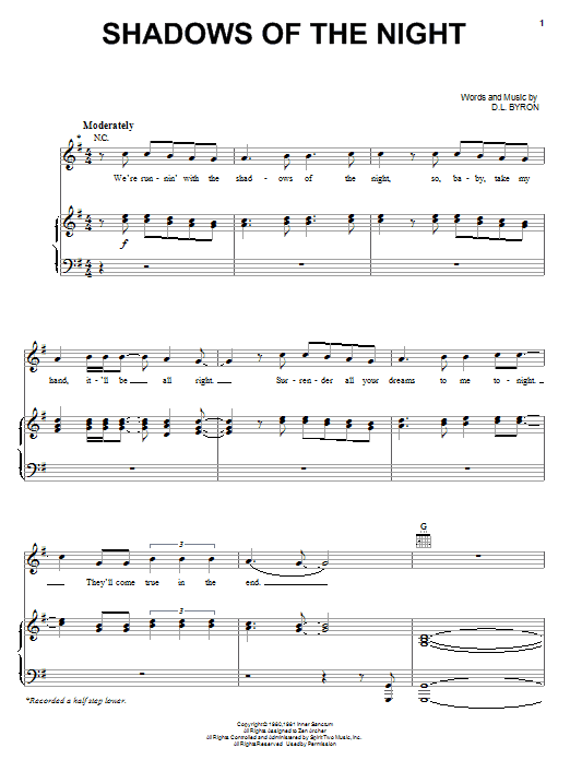 Download or print Pat Benatar Shadows Of The Night sheet music, chords and digital score arranged for Piano, Vocal & Guitar Chords (Right-Hand Melody). This Pop score includes 5 page(s).