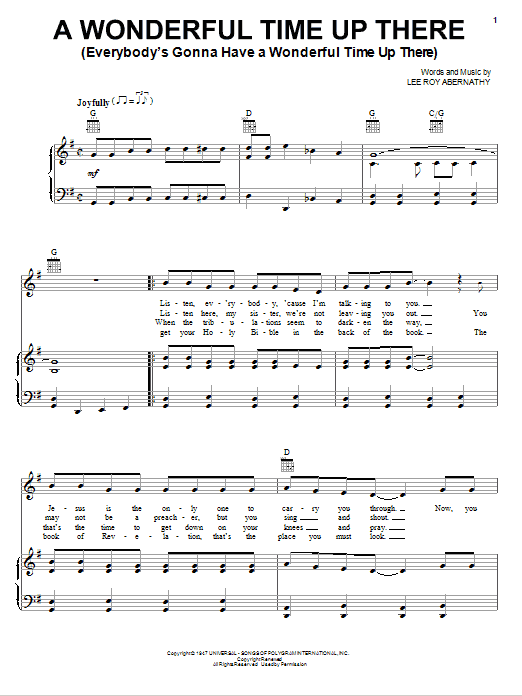Download or print Pat Boone A Wonderful Time Up There (Everybody's Gonna Have A Wonderful Time Up There) sheet music, chords and digital score arranged for Piano, Vocal & Guitar Chords (Right-Hand Melody). This Inspirational score includes 4 page(s).