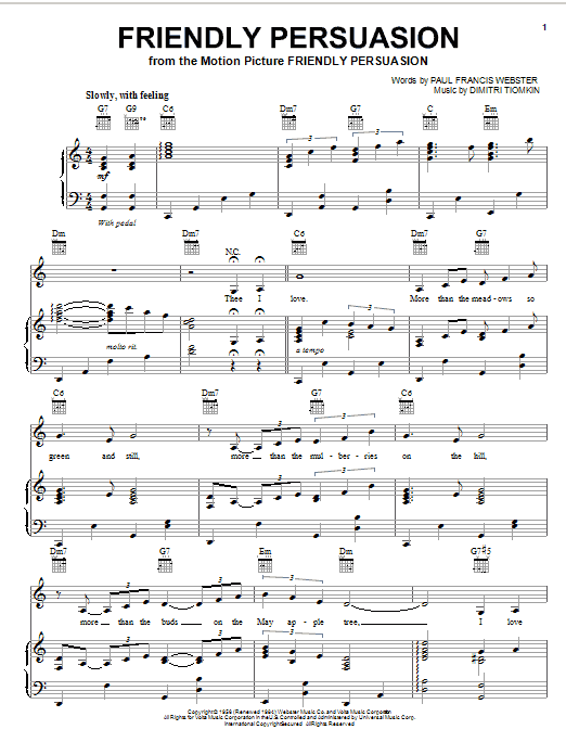 Download or print Pat Boone Friendly Persuasion sheet music, chords and digital score arranged for Piano, Vocal & Guitar Chords (Right-Hand Melody). This Film/TV score includes 4 page(s).