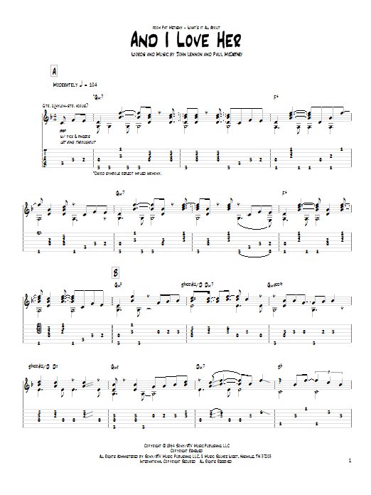 Download or print Pat Metheny And I Love Her sheet music, chords and digital score arranged for Guitar Tab. This Pop score includes 6 page(s).