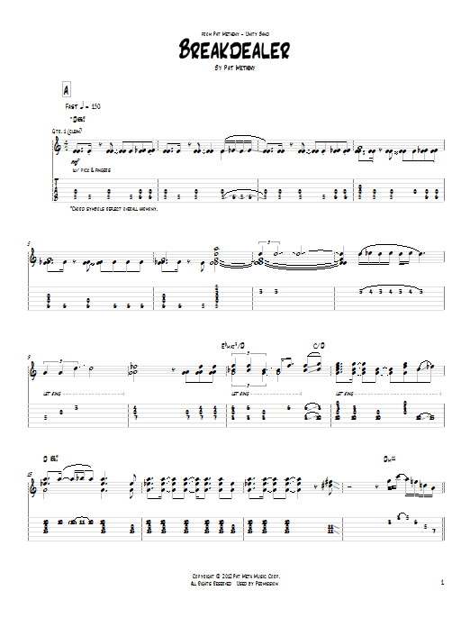 Download or print Pat Metheny Breakdealer sheet music, chords and digital score arranged for Guitar Tab. This Jazz score includes 17 page(s).