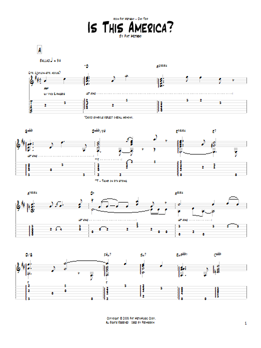 Download or print Pat Metheny Is This America? sheet music, chords and digital score arranged for Guitar Tab. This Jazz score includes 7 page(s).