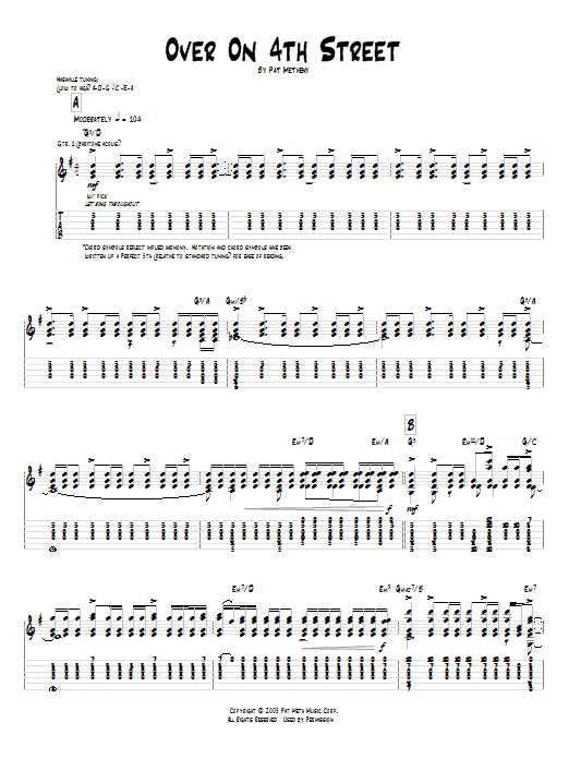 Download or print Pat Metheny Over On 4th Street sheet music, chords and digital score arranged for Guitar Tab. This Jazz score includes 8 page(s).