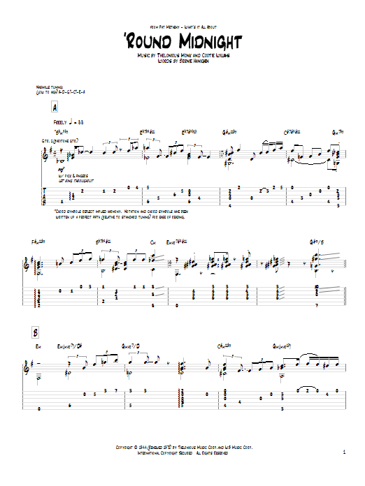 Download or print Pat Metheny 'Round Midnight sheet music, chords and digital score arranged for Guitar Tab. This Pop score includes 10 page(s).