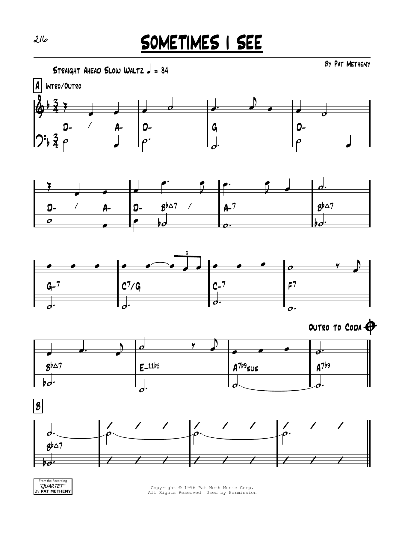 Download or print Pat Metheny Sometimes I See sheet music, chords and digital score arranged for Piano Solo. This Jazz score includes 4 page(s).