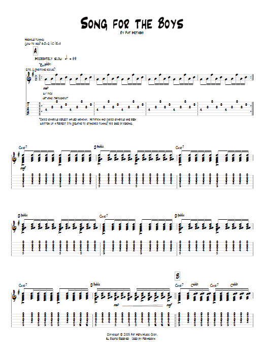 Download or print Pat Metheny Song For The Boys sheet music, chords and digital score arranged for Guitar Tab. This Jazz score includes 10 page(s).